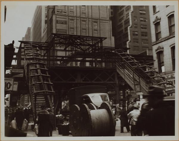 Sixth Avenue, at W. 38th Street, showing the 38th Street station of the Sixth Avenue "El" in a skeletal form. The photographer is viewing same in a westward direction on 38th Street from a point to the east of the Avenue and across to Broadway. The large loft structures in the left center face on