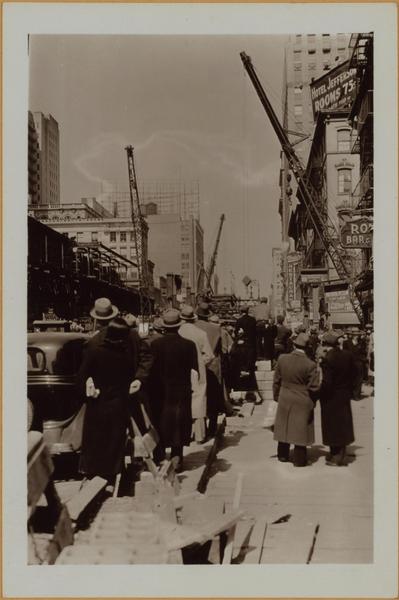 Sixth Avenue, north from W. 38th Street, showing demolition of the old "E1" line. Note the interested spectators. The wooden planking under foot covers in the subway excavation that is proceeding also.