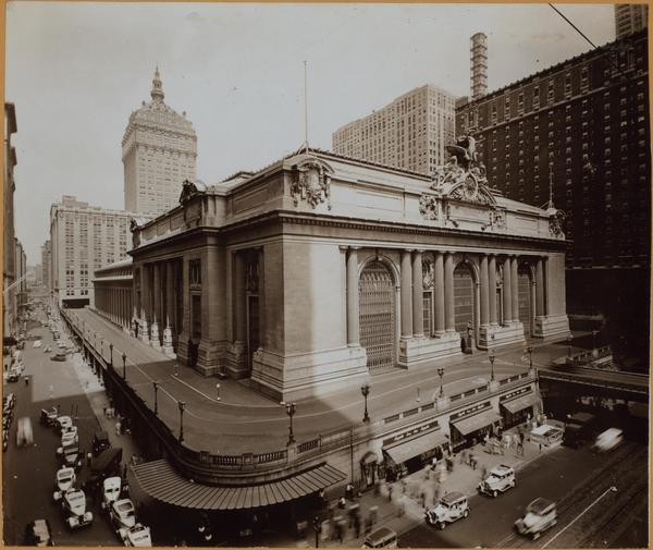East 42nd Street at the N.E. corner of Vanderbilt Ave., showing the Grand Central Railroad Station extending to 45th Street on the latter Ave. Park Ave. traffic passes on the bridge over East 42nd Street (right) and around Grand Central Station on an elevated vehicular driveway, passing underneath the New York Central Building, at East 45th Street, then resuming its normal course on Park Ave., north from East 46th Street. The station is the terminal for the New York Central Railroad, and the New York, New Haven and Hartford Railroad. It was opened in 1913.