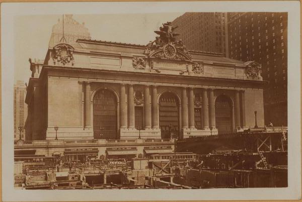East 42nd Street, at the N.E. corner of Vanderbilt Ave., as seen from Park Ave. Shown across debris of the former Hotel Belmont, is the Grand Central Station of the N.Y.C.R.h. Note the vehicular viaduct extending from Park Ave., and encircling the station. On the extreme right, appears a portion of the Hotel Commodore. Across the skyline is seen